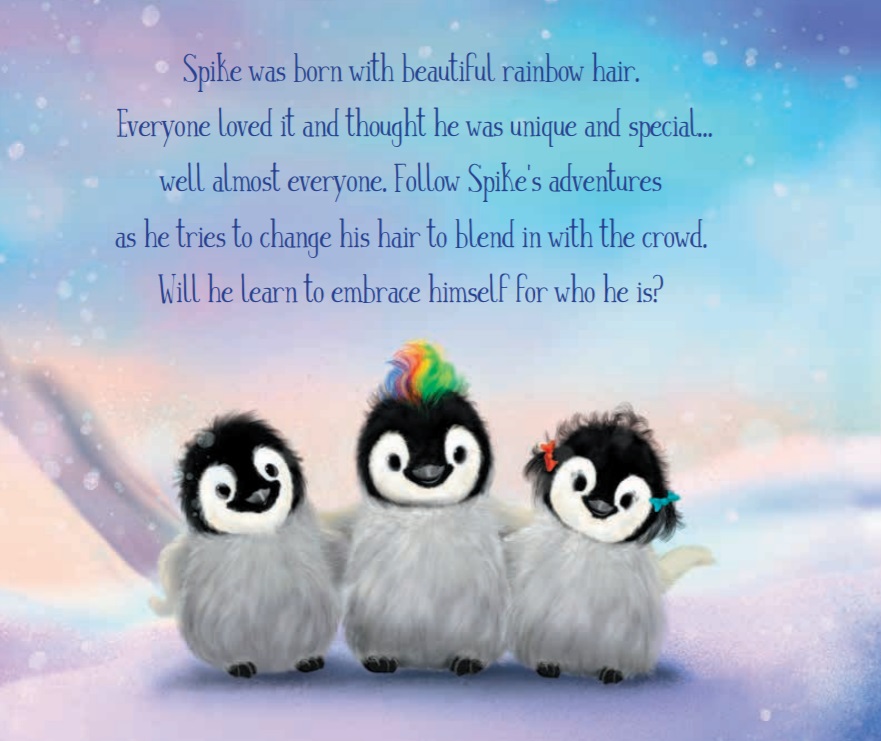 Spike is a very cute, very fluffy baby penguin. He was born different – with colourful hair. Whilst everyone else thinks his hair is incredible, Spike doesn’t like that it makes him stand out. He tries various different ways to ‘blend in’, but it’s not as easy as he thinks. As Spike’s story concludes, there’s an important message for the reader to take away with them.